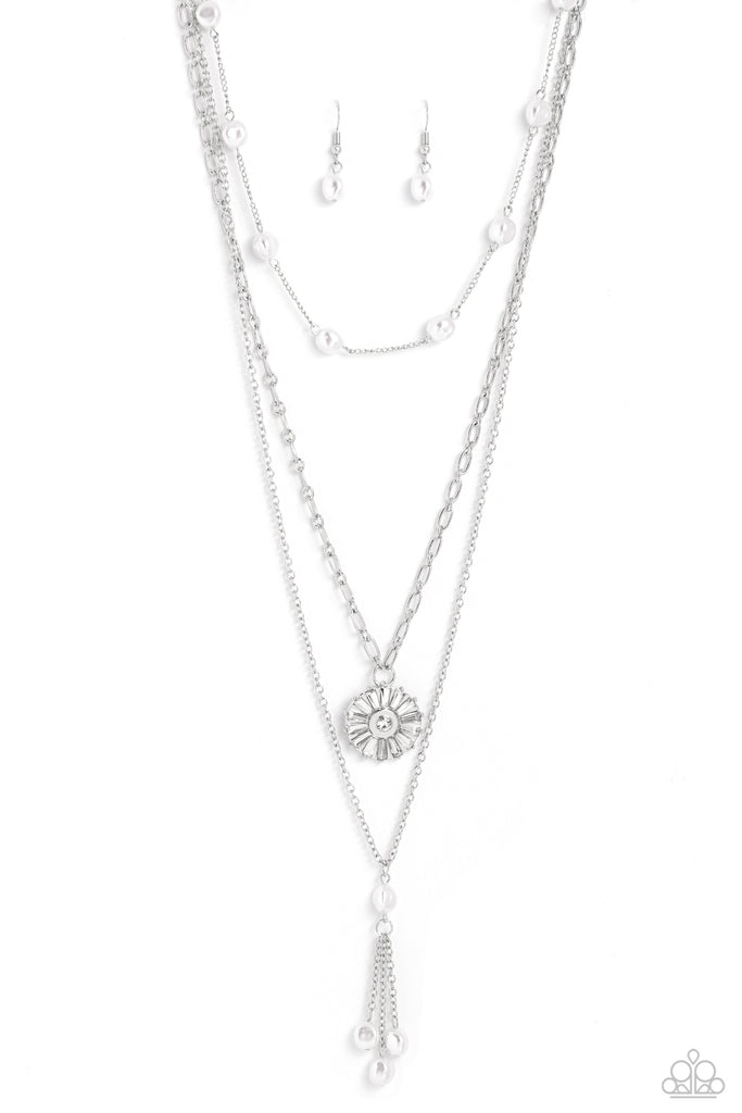 Three shimmery silver chains layer across the chest, with each strand featuring a different motif. Featured on the uppermost chain, white baroque pearls sporadically dot a dainty silver chain. Below it, a silver paperclip chain emerges, with a circular pendant adorned in a classy collection of emerald-cut white gem bars fanning out from a white rhinestone center. Finally, on the lowermost layer, baroque pearls drip into a flirtatious tassel, infusing the design with subtle movement. Features an adjustable clasp closure.
