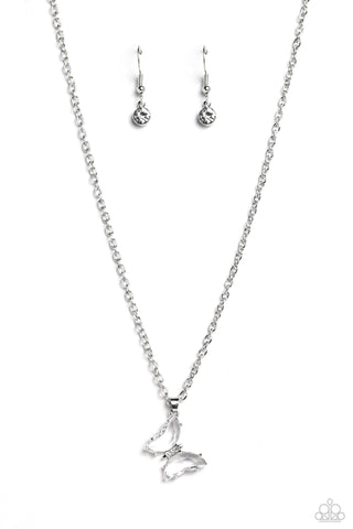 Infused with faceted white gem wings, a shiny silver butterfly pendant swings from a dainty silver chain below the collar for a whimsy flair. Features an adjustable clasp closure.