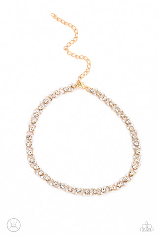 Delicately etched in subtle shimmer, a classic gold chain is infused with dainty white pearls and white-pronged gems for a dainty display of class that drapes across the collar. Features an adjustable clasp closure.