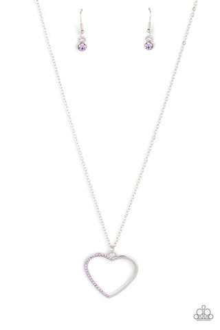 One side of a shiny silver heart frame has been adorned in dainty purple rhinestones, resulting in a flirtatious pendant at the bottom of a dainty silver chain. Features an adjustable clasp closure.