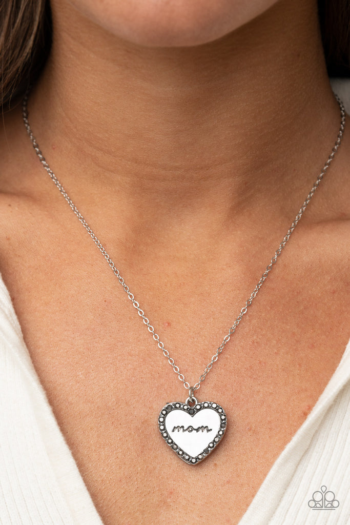 Infused with a smoky hematite rhinestone encrusted silver heart, a silver heart shaped pendant is stamped in the word, "Mom," as it swings below the collar, creating a sparkly sentimental statement piece. Features an adjustable clasp closure. Mother’s Day