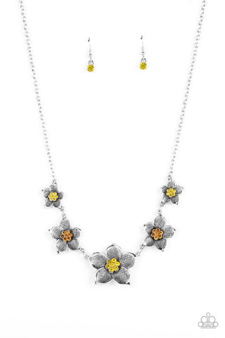 Gradually increasing in size, textured silver floral frames featuring yellow and orange rhinestone encrusted centers delicately alternate below the collar for a fabulously floral fashion. Features an adjustable clasp closure.
